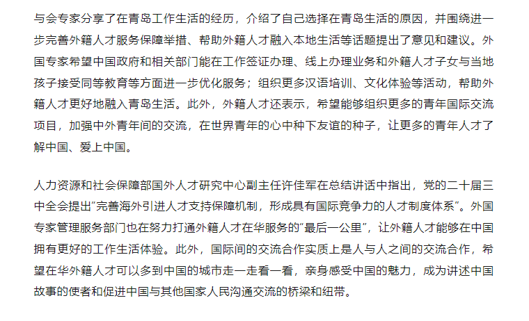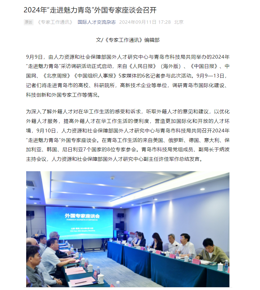 2024年9月9日,由人力資源和社會保障部國外人才研究中心與青島市科技局共同舉辦的2024年“走進魅力青島”采訪調研活動正式啟動,來自《人民日報》(海外版)、《中國日報》、中國網、《北京周報》《中國組織人事報》5家媒體的6名記者參與此次活動。中電綠網領導參加了2024年“走進魅力青島”外國專家座談會。